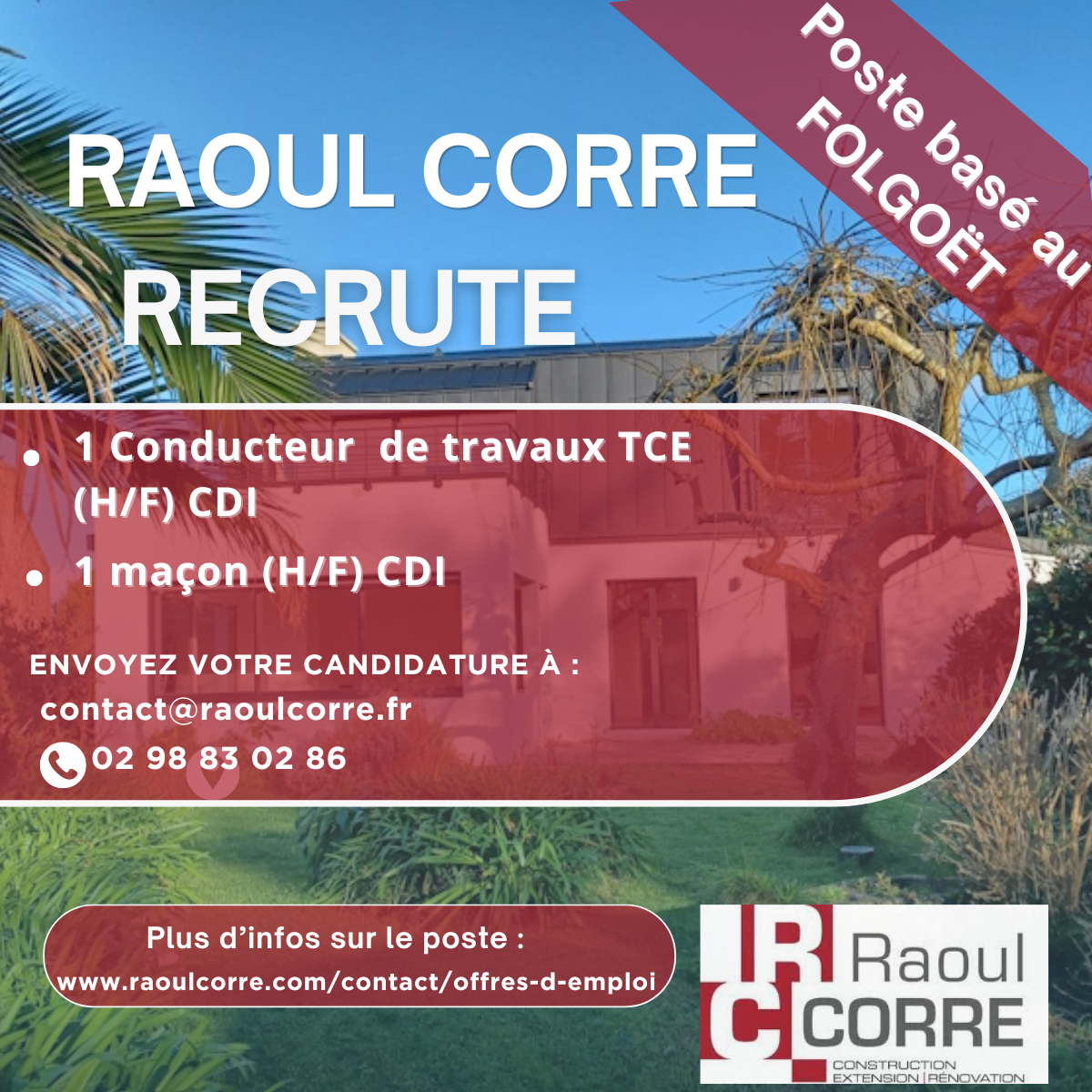 Dans le cadre de son développement, l'entreprise RAOUL CORRE développe ses activités sur la presqu'île de Crozon pour tous vos projets d'extension, de rénovation, de construction de maison individuelle, d'agencement.